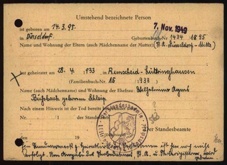 Er hat am 28.04.1933 die Wilhelmine Agnes gesch. Bußbach, geb. Schleip, geb. 12.03.1901 in Eschweiler, die Ehe geschlossen.
