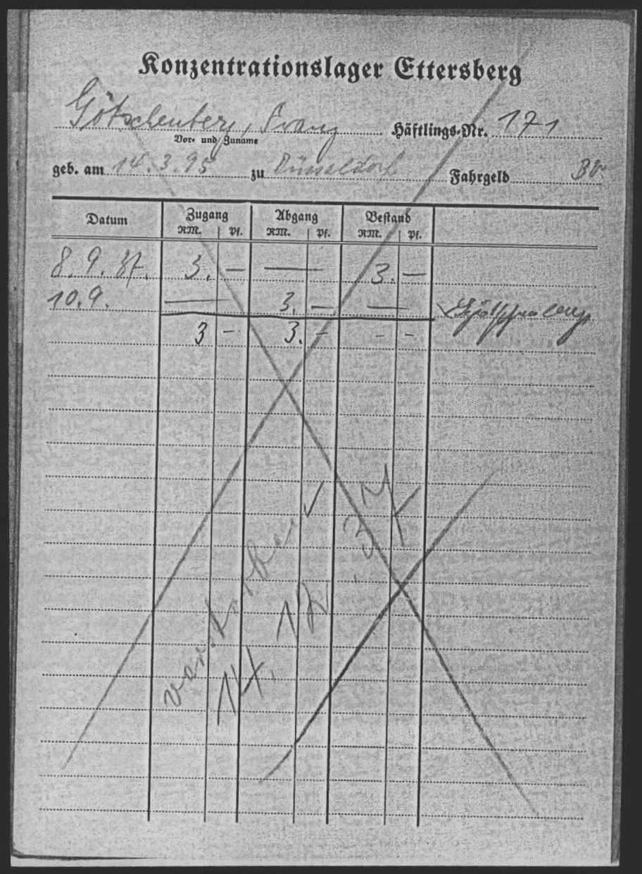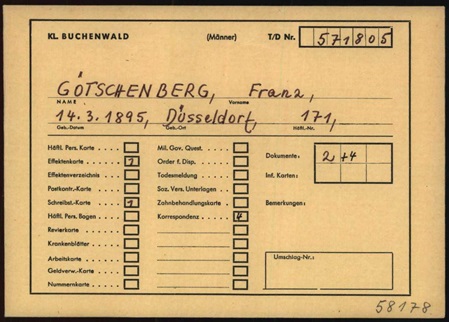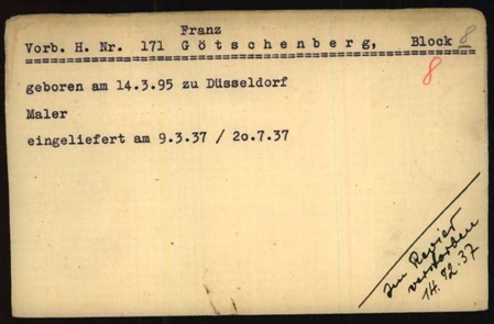 Franz wurde am 09.03.1937 verhaftet und am 29.07.1937 als Häftling ins KZ Buchenwald mit der Häftlingsnummer 171 eingeliefert. Am 14.12.1937 dort verstorben und in Weimar kremiert. Warum er im KZ einsaß ist nicht überliefert.